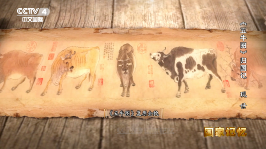 《五牛图》是唐代画家韩滉留存于世的唯一一件作品。五头牛从右至左一字排开,各具状貌,姿态互异。这幅画现存于故宫博物院。