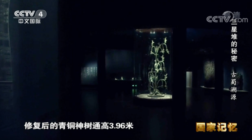 一号青铜神树是全世界已发现的最大单件青铜文物。修复后的青铜神树通高3.96米,分为三层,每层三枝,每枝上有一仰一垂的两果枝,九只神鸟分立于枝干上,造型精巧灵动,现存于三星堆博物馆。馆内还藏有铜人面具、黄金权杖、纵目面具、青铜大立人、青铜扭头跪坐人像等等。