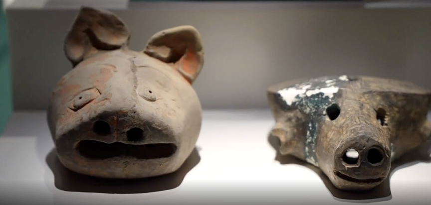 陶猪首,外观卡通,全身布满彩绘,眼睛微微凸起,有两只大大的耳朵,模样憨态可掬。网友评价是殷商人的“玩具手办”。2003年出土于殷墟孝民屯M7,现存于河南安阳殷墟博物馆新馆。